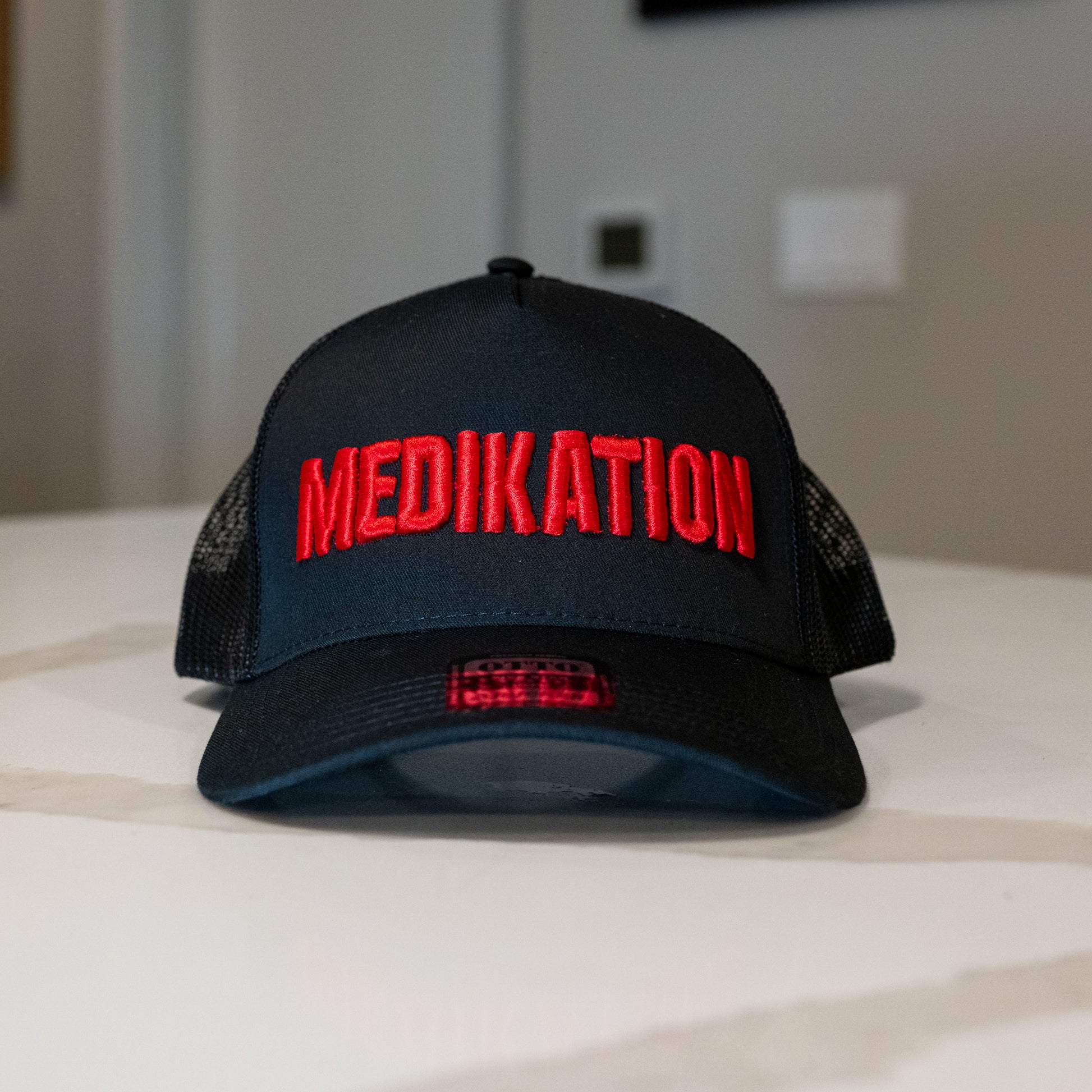 Built for fans of Medikation LIVE, this trucker hat now features bold MEDIKATION lettering in striking red stitching — a sharp, patriotic nod to American grit and spirit. Lightweight mesh keeps you cool anywhere, and the structured front panel gives it that clean, confident look. Whether you’re live on stream or out grinding in the real world, this hat carries that unapologetic American energy.